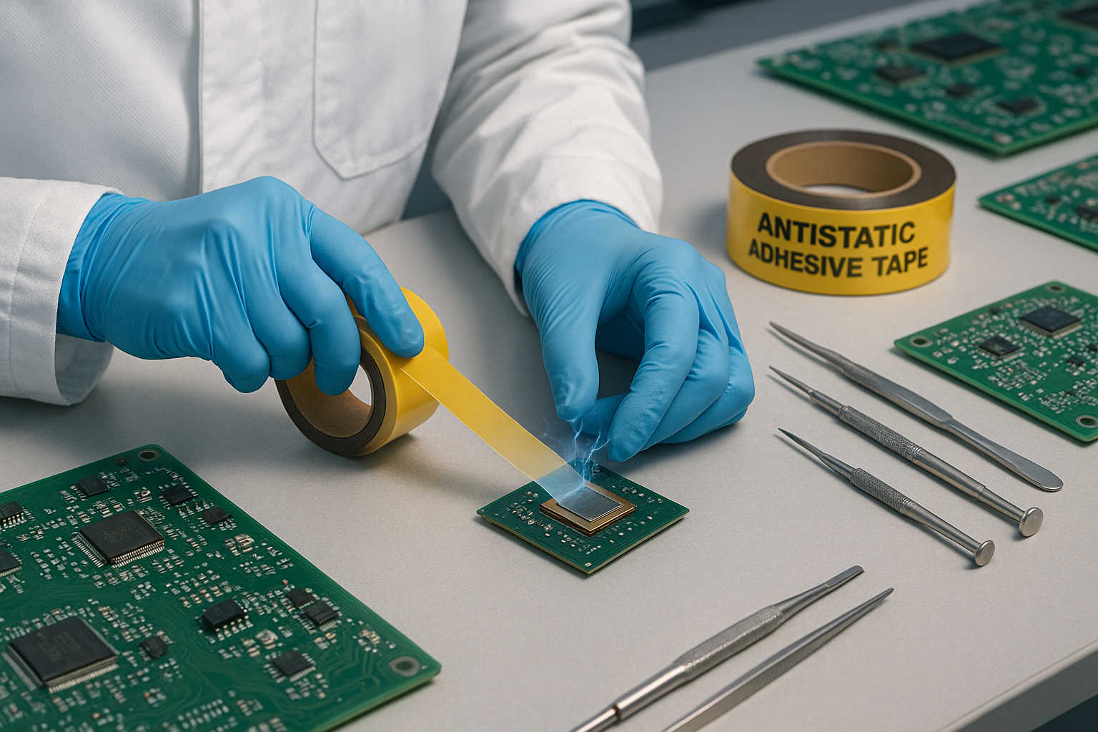 A montagem de placas de circuito impresso (PCB) e o manuseio de componentes semicondutores estão entre os casos de uso de maior prioridade para fitas antiestáticas. Nas operações de coleta e colocação, os alimentadores de fita e as fitas transportadoras que acumulam carga podem falhar na alimentação ou atrair contaminantes; em ambientes de refluxo e solda por onda, partículas carregadas podem causar defeitos de solda. O uso de fitas com resistividade de superfície controlada ajuda a manter janelas de processo seguras contra ESD e minimiza falhas de montagem causadas por eventos eletrostáticos.